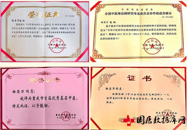 徐昌万,1964 年生,毕业于成都中医药大学和川北医学院,本科学历,主任中医师,重庆市首届优秀基层中医。现任中华中医药学会难治病研究专家委员及肝病研究协作组成员;中华中医药学会肝病分会、血液病分会委员;中华中医药学会民间诊疗技术与验方整理研究分会常务委员;重庆市中医药学会内科专委会委员;重庆市中医药学会传统诊疗技术专委会副主任委员;万州区中医药学会理事;万州区中医药学会民间医药专委会主任委员;万州区卫健委民营医疗机构协会副会长。1984 年开始从事中医工作,1996 年在重庆大学三峡医院(原重庆三峡中心医院)进修中医内科临床半年,拜全国名老中医李寿彭主任医师为师,深得恩师真传。1998 年于成都中医药大学附属医院进修内科临床 1 年。2018 年经国家中医药管理局相关部门推荐并审核拜全国著名脾胃病专家、国医大师李佃贵教授为师,成其学术传承弟子,并跟师临床。2005 年应中国医师协会特邀到北京人民大会堂参加了"第二届中国百名医学家峰会",受到了全国人大副委员长和卫生部部长亲切接见。2006 年从公立医院离职,自办中医诊所。因业绩突出,技术过硬,经验丰富,2007 年应邀到北京人民大会堂参加"全国民营医疗机构表彰大会",被国家中医药管理局批准授予为 "全国优秀民营中医医疗机构负责人"称号;诊所被授予为"全国优秀民营中医医疗机构",卫生部副部长兼国家中医药管理局局长王国强亲自颁奖。