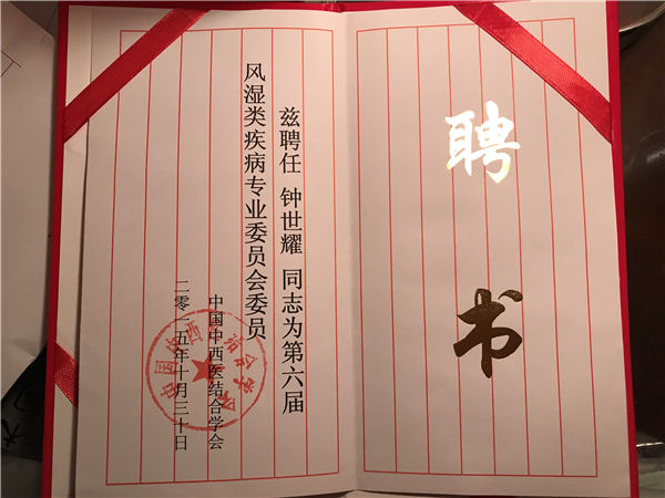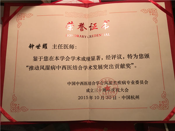 2015年获中国中西医结合学会风湿类疾病专业委员会“推动风湿病学术发展突出贡献奖”