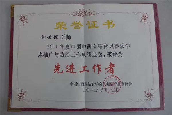 2008年获中国中西医结合学会风湿类疾病专业委员会“推动风湿病学术发展贡献奖”