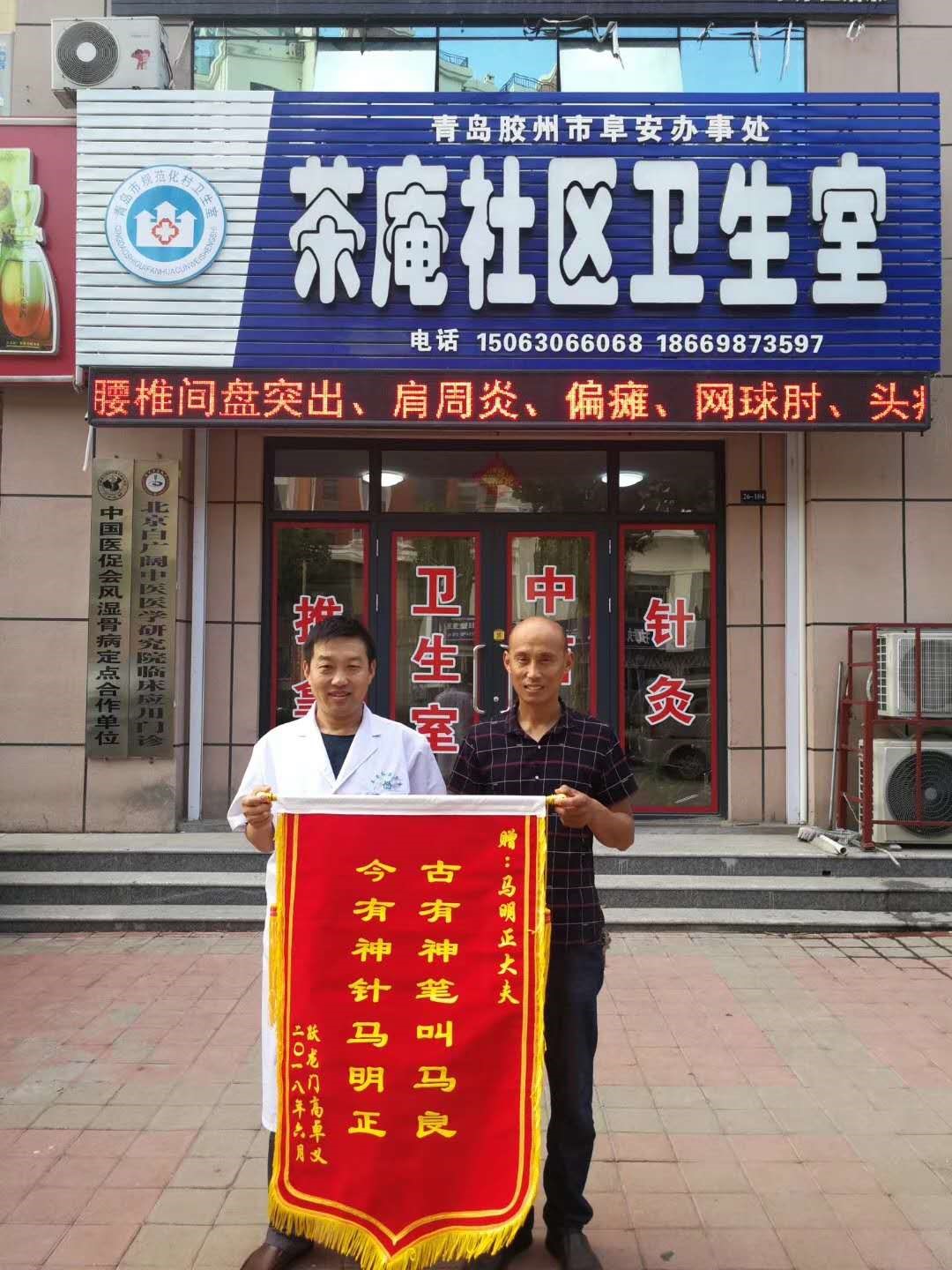马明正,男,58岁,中专文化,党员,联系方式:15063066068,诊所名称:胶州茶庵社区居委会卫生室。