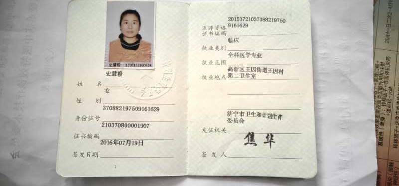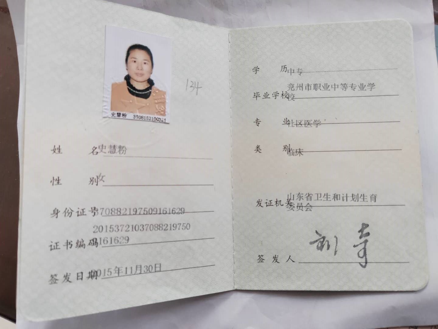 史慧粉,女,43岁,中专文化,群众,联系方式:15965375360,诊所名称:山东省济宁市兖州区王因镇第二卫生室。
