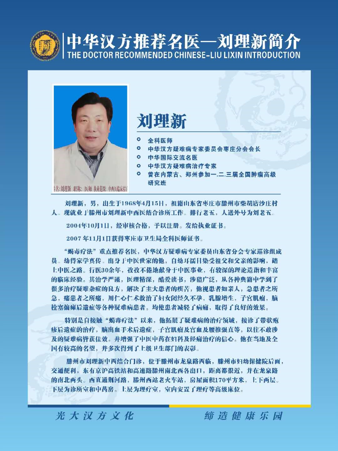 刘理新,男,55岁,中专文化,中共党员,联系方式:13963211398,诊所名称:山东省滕州市北辛街道育才路社区服务站。