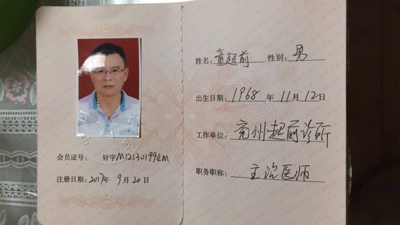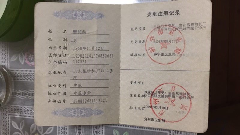 董超前,男,51岁,大专文化,中共党员,联系方式:15554713199,诊所名称:山东省济宁市兖州超前诊所