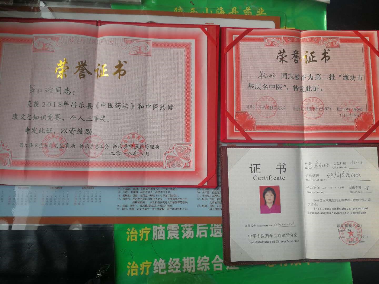 毕业于潍坊医学院中西医结合专业,主治中医师,执业中药师。2016年被潍坊市卫计委,潍坊市人力资源保障局,潍坊市中医药管理局评为“潍坊市基层名中医。”