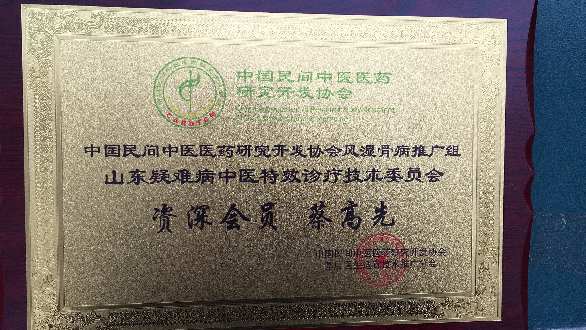 中国民间中医医药研究开发协会山东分会蔡高先个人荣誉或成就