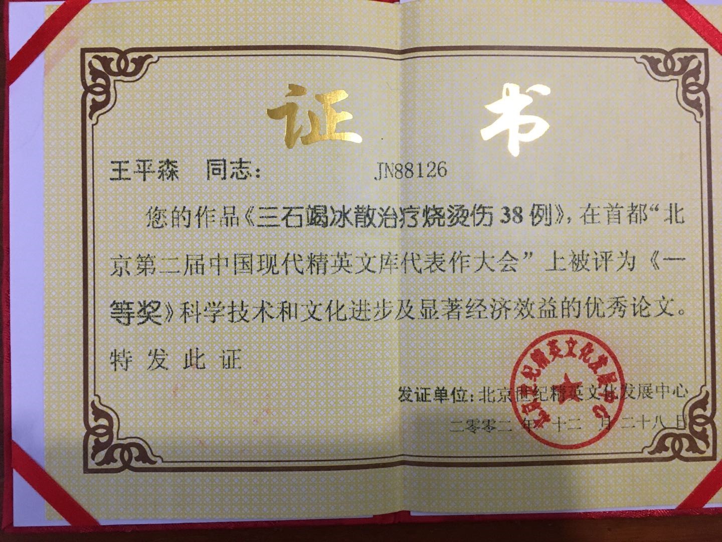 中国民间中医医药研究开发协会山东分会王平森个人荣誉或成就