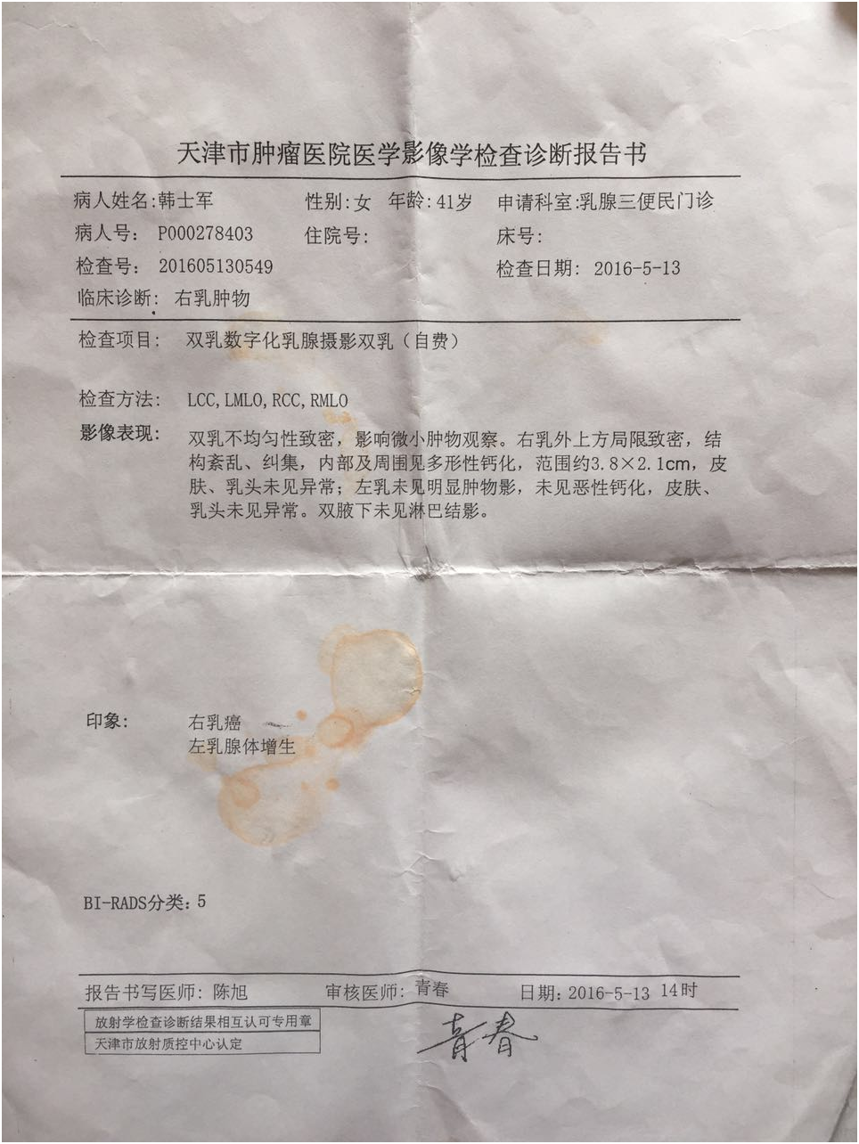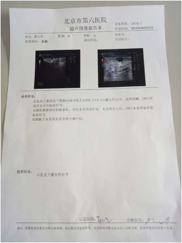 2016年5月,韩女士跟随姐姐去武清区一养生堂,听中医技术创新推广专业委员会会长胡小平教授《骨骼与健康》公益课,并在会后做了身体检查。当时胡教授提示她乳腺出了问题,建议她到天津大医院检查,并嘱咐她查出问题千万别动手术,特色中医绿色疗法不打针不吃药原生态可为她治疗。