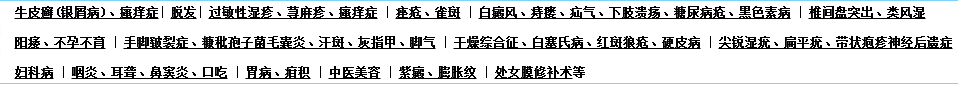 对银屑病、牛皮癣、白癜风、痤疮、扁平疣、骨质增生、阳痿、男女性病、老年性瘙痒症、冻疮、疤痕、疙瘩、不育症、脱发、蛇皮人黑色素、口吃、烫伤等有独特治疗方法。