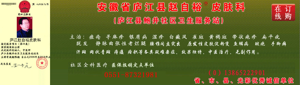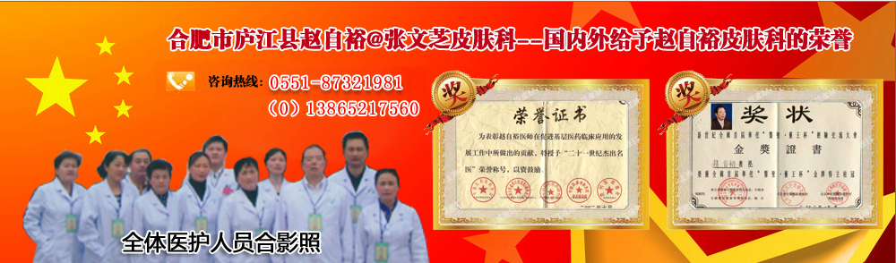 赵自裕老师带领全体工作人员通过多渠道、多途径的拜师访友,无数次参加全国性乃至世界性医技交流,受到不少专家、教授称赞。几名医务人员通过37792部队军校几年培训学习,同时多次到北京、上海、南京、山东、江西、广州、新疆等地学术交流,受益匪浅。所在地县医院、中医院分别对我们工作给予积极指导,大大地充足了我们的技术,并搜集整理了大量的单方、验方。在内外科等杂症治疗中疗效显著,在省内外、周边县市具有很高知名度,接待患者十余万人次。有独特的治疗方法.疗效服人。 特别是在各种顽固性皮肤病《囊肿性痤疮.寻麻疹.湿疹性皮炎.顽固性牛皮癣》咽炎、耳炎、鼻炎、腰椎间盘突出、颈椎病、肩周炎、前列腺炎、老胃病、妇科等久制不愈的怪病方面,包治包好。价格比兄弟医院优惠50%。对包皮过长、狐臭、疝气、痔瘘、老烂腿等无需手术,包治包好,一次性根除。深受患者和政府认可。专治肝硬化.肝腹水.效果显著.对银屑病、牛皮癣、白癜风、痤疮、扁平疣、骨质增生、阳痿、男女性病、老年性瘙痒症、冻疮、疤痕、疙瘩、不育症、脱发、蛇皮人黑色素、口吃、烫伤等有独特治疗方法。 赵自裕老师的专家团队三十多年来治愈率95%以上,得到了很多荣誉;被地方政府和巢湖市聘为“政风行风监督员”、个私协党支部书记庐江县个私民营企业协会副会长、所在地个私协副会长、优秀共产党员、先进党支部,省市县优秀诚信单位、光彩之星、创业之星等称号,赵自裕医师被国家工商局认定为商标注册。同时加入《中国民间中医验方集》编委会副主任。我们将不断努力,攻克疑难杂症。为解除患者痛苦,全体医务人员生命不息,战斗不止,做一个对社会有贡献的--白衣天使。