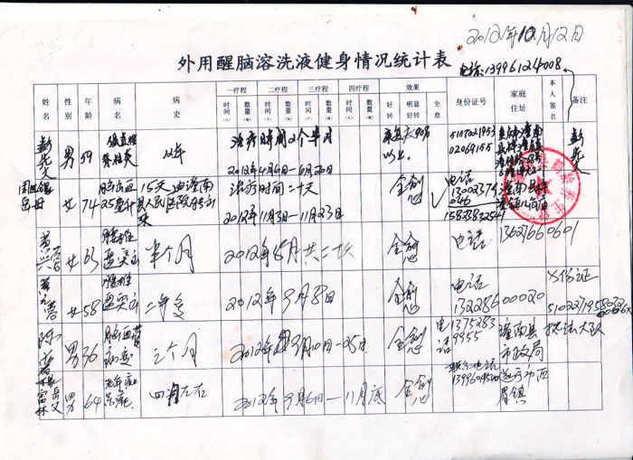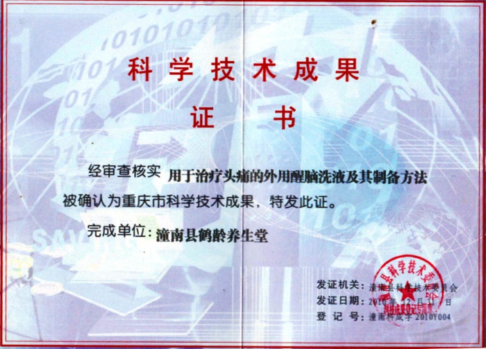 本人从医(特殊疗法,内病外治及预防)三十余年,发明了外用醒脑浴洗液,于2010年7月7日获国家发明专利证明书。又于2016年四月申请神内通络液,现已进入公开审理阶段。本产品能容预防、治疗康复一体,纯中草药制成500毫升一瓶的液体和50毫升一瓶的油液适用于高血压、高血脂、血糖偏高、脑出血、脑血栓后遗症、强直性脊柱炎颈椎、腰椎骨质增生、腰椎盘突出、风湿关节炎、小儿麻痹症后遗症、颈动脉血管狭窄。早期帕巾森氏症、手脚麻木、肢骨头坏死。(专利获重庆及潼南县优秀成果奖)。根据当前医疗状况具有相当的市场优势。