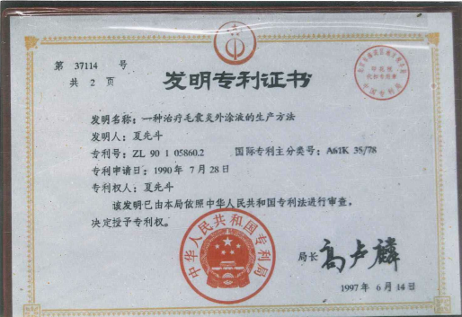 该搽剂属中草药配方而成,具有清热解毒、消炎杀虫、散结止痒的功效,经政府卫生权威机构检测,对多种病菌的最高杀(抑)菌率达到99.99%,不仅用于毛囊炎、痤疮、痒疹、疱疹、皮炎、湿疹、烫伤、痔疮、阴道炎、阴痒症、皮肤瘙痒证、毛囊角化症等多种皮肤病性病疗效显著,而且对多种病毒类皮肤病,特别是对水痘、带状疱疹(VZV)和生殖器疱疹(HSV-2)等具有奇特的治疗效果。还可作皮肤的消毒灭菌、洗浴、创伤和术后感染等皮肤外用。并且无毒副反应,对皮肤无刺激性、疗效稳定,药源丰富,药价便宜,使用方便。原获中国发明专利证书,川卫消准(证)字批文,市政府科技进步一等奖,并获中国商标证书。被列为四川省重点科技攻关项目。2003年1月已通过省科技厅组织的科技成果鉴定,结论为:“研究结果达到国内同类研究先进水平”。是非常成熟可行的中医药科研技术项目。