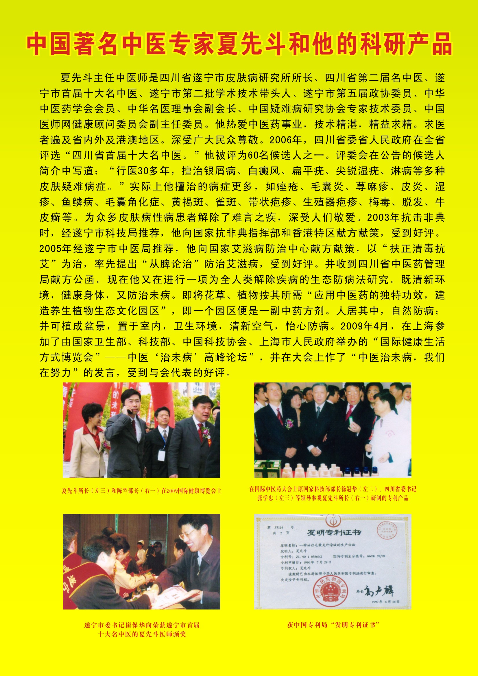 夏先斗主任中医师是四川省遂宁市皮肤病研究所所长、四川省名中医、中华名医理事会副会长、遂宁市首届十大名中医、市学术技术带头人、遂宁市第五届政协委员、中国疑难病研究协会专家技术委员、中国医师网健康顾问委员会副主任委员。他热爱中医药事业,技术精湛,精益求精。求医者遍及省内外及港澳地区。门庭若市,妙手回春,最高日门诊量达130人次以上。