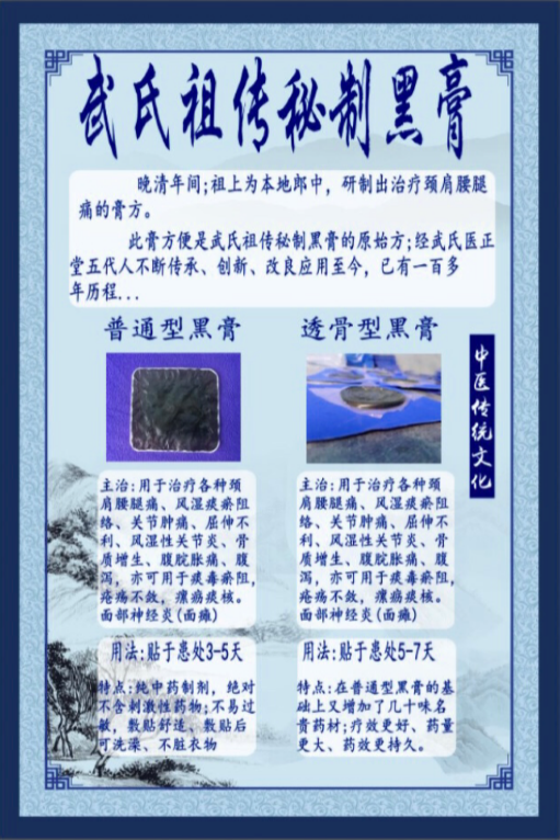 武⽒医正堂将近两百年历程,历经五代不断传承、 创新、改良,现已有祖传⽤药数十种:包括汤剂·丸剂·散·剂·膏剂·喷剂…结合祖传⼿法正⻣治疗颈肩腰腿痛、⻣伤、⻣痛、 ⻣折疗效显著 3-5次即可治愈,除此之外针对⽪肤病、鼻炎、中医药慢病调理均匀独特的治疗方式疗效突出。