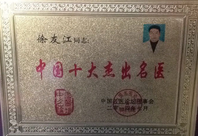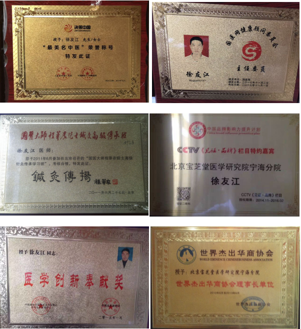荣誉:中国十大杰出名医、中国名医论坛理事会主席团副主席、知名中医药专家、徐氏奇天疗法持有人、中国北京宝芝堂医学研究院高级研究员、国家中医药管理局特色疗法传承人、北京徐友江疑难病医学研究院院长。