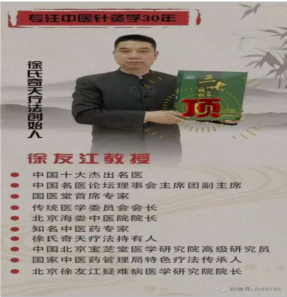 “徐氏奇天疗法”创始人徐友江作为众多中医工作者其中的一员,多年来,始终坚持传承中医文化,并不断践行创新精神。当前,中医文化逐步发展,成为走向世界不可阻挡的潮流。徐友江紧跟时代步伐,精研中医学精典著作,并将「益寿堂秘方」融入其中,推陈出新,独创了一套全新医学疗法,即“徐氏奇天疗法”。据临床显示,该疗法对治疗颈椎病、腰间盘突出、肩周炎、坐骨神经痛、关节炎、痛风、类风湿等疾病有独特的疗效,开创了中医治愈美尼尔综合症及心脑血管疾病狭窄95%不搭支架的先河。