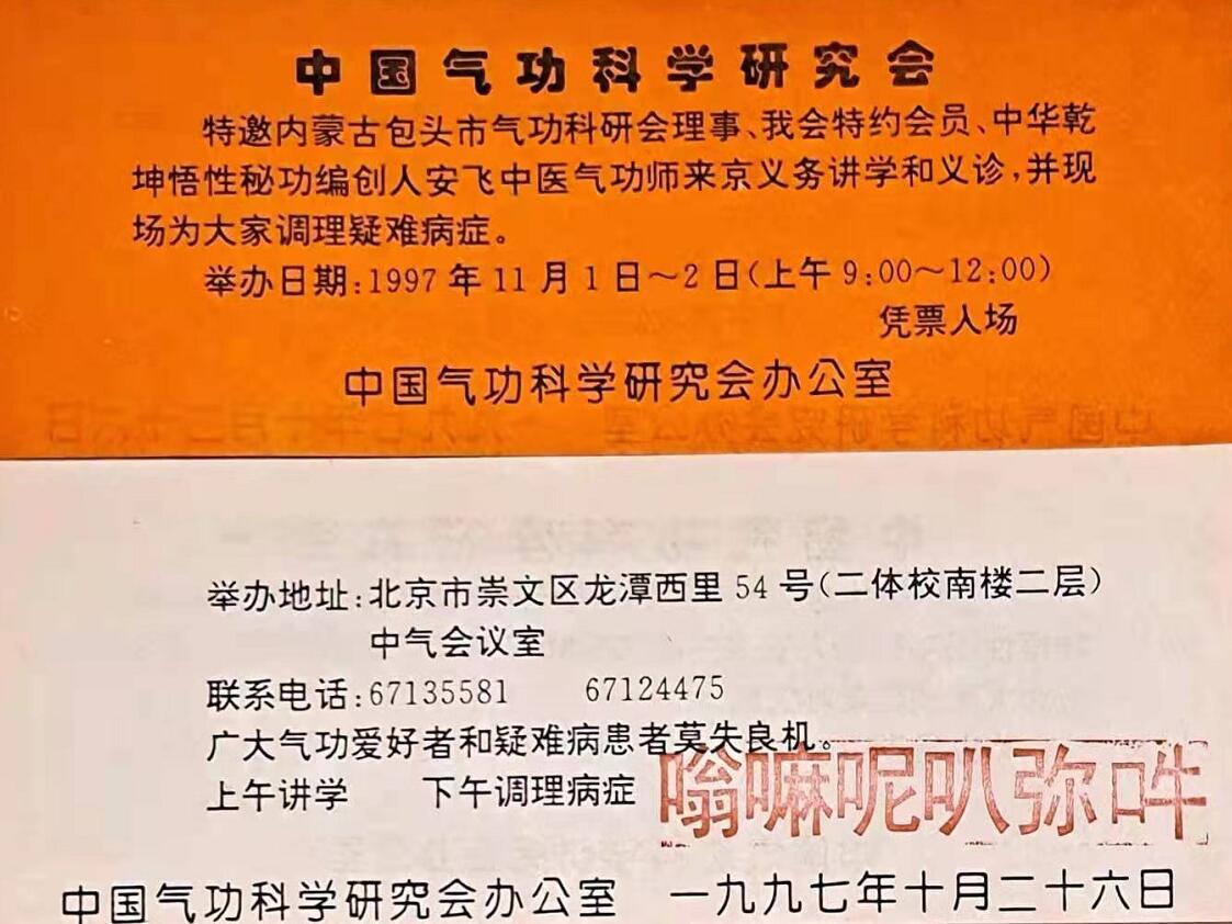 一九九七年十一月一至二日,在中国气功科学研究会办公室气功讲座,参加人数 90 多人,由中国气功科学研究会领导张前碧老师主持。听课的有各家功法的代表和练功有 素的老师,还有练五六种功法的气功爱好者和疑难病患者。有的试探功能功理的,有实心求 学治病的。 讲座开始后,我下意识改变大脑思维,布了气场,使人体静电、电磁波反射辐射,很多人便发热出汗,有关节疼痛的听课后不疼了和减轻的,脑血管病和高血压病的头脑清醒,眼睛发亮全身舒适轻快。在场的都举手表示有很好的感觉和效果。