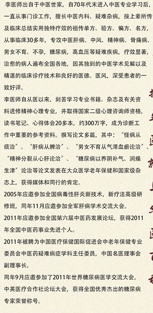 李汉彬,男,1960年11月出生,广西北流市人,中医大专学历,中共党员,中医执业主治医师,国家二级心理咨询师,现任陕西华西糖尿病研究所主任,华西糖尿病专科医院主任,世中联糖尿病学术委员会理事,全国疑难病中药学主任委员,全国名医理事会副理事长等职。