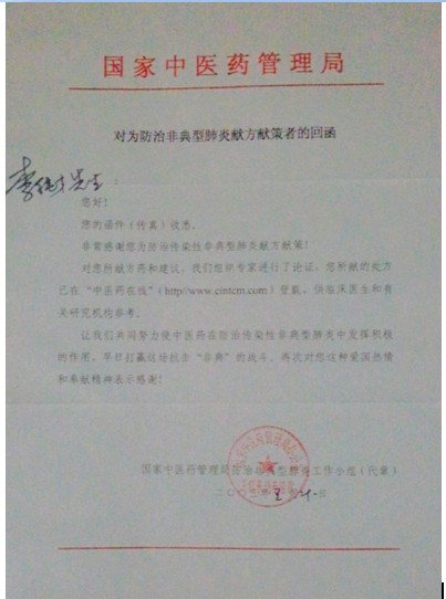 让我们共同努力,使中医药在防治传染性非典型肺炎中发挥积极的作用,早日打赢这场抗击“非典”的战斗。再次对您这种爱国热情和奉献精神表示感谢! 国家中医药管理局办公室