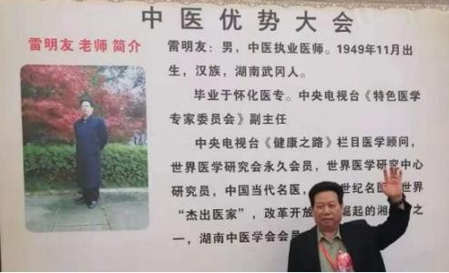 雷明友,男,中医执业医师,1949年11月出生,湖南武冈人,毕业于怀化医专。中央电视台《特色医学专家委员会》副主任,央电视台《健康之路》栏目医学顾问,世界医学研究会永久会员,世界医学研究中心研究员,中国当代名医,中国世纪名医世界“杰出医家”,改革开放后《崛起的湘军》之一,湖南中医学会会员。
