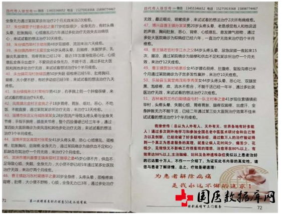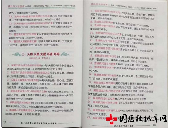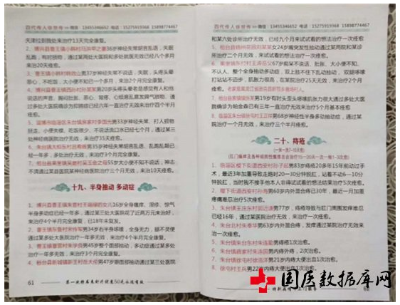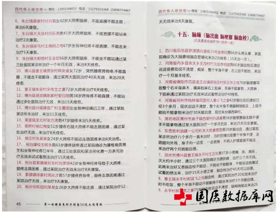 1.四川省岳池县罗渡镇兴盛街25号金奇印男 66 岁头疼头晕,某医院确诊为大脑萎缩脑血管硬化来治 2 次痊愈(15 天治一次)。