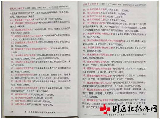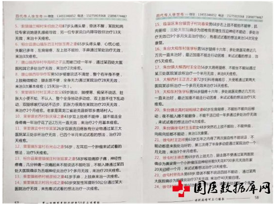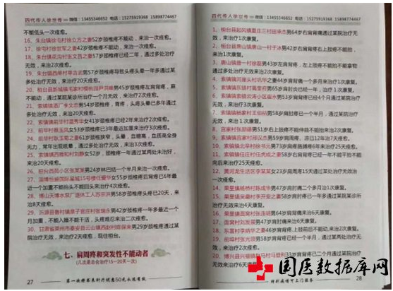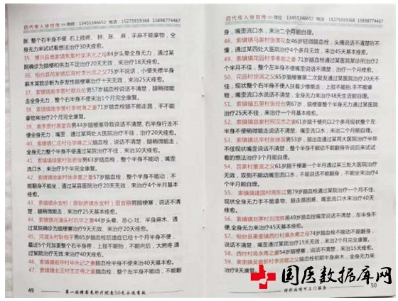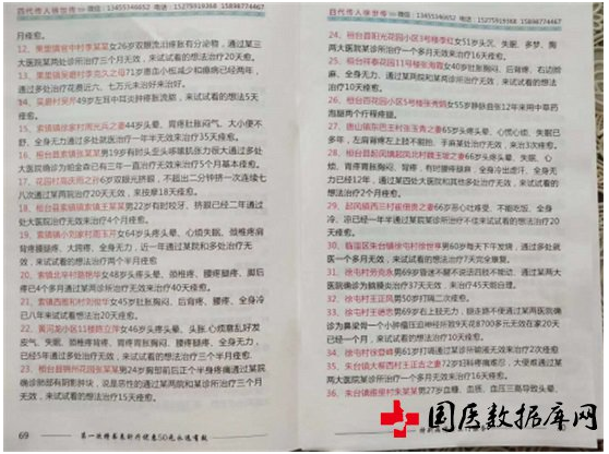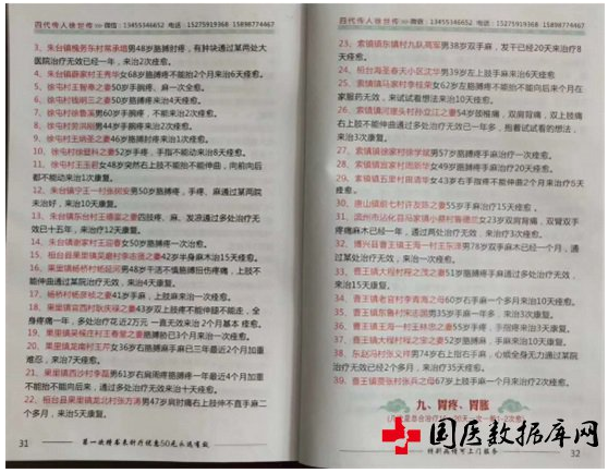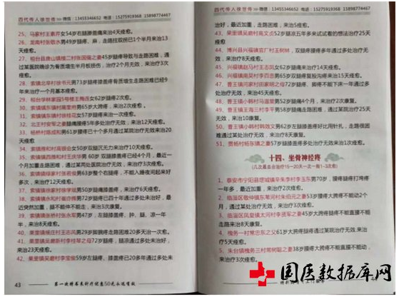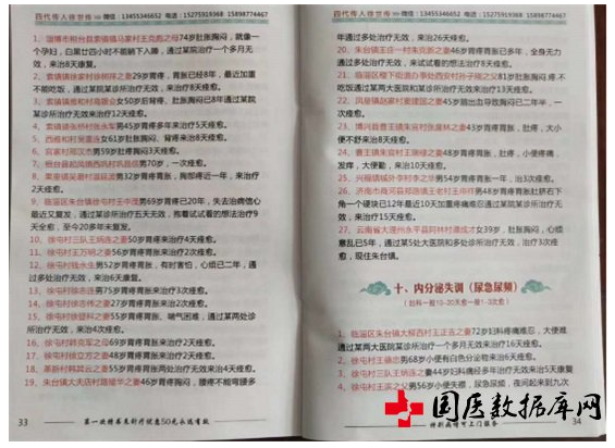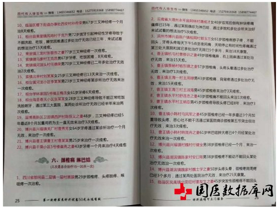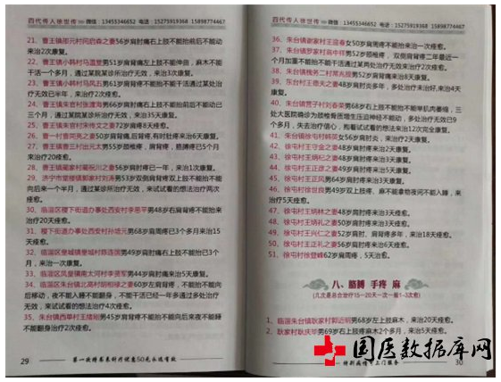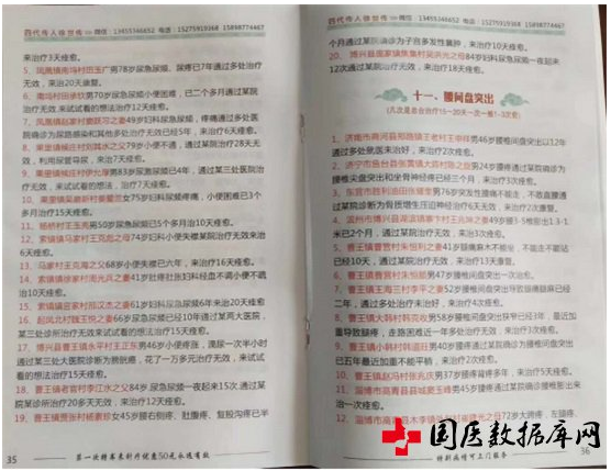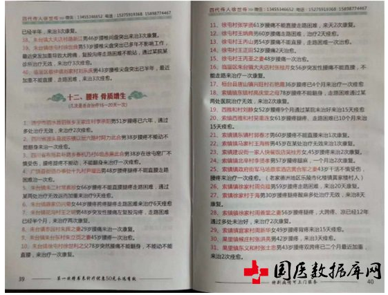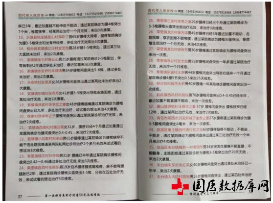 1、淄博市高青县木李镇老董村董春生之妻 40 岁腰椎狭窄骨质增生、背疼、心烦失眠、胃疼、大小便不舒畅 3 年通过多处就医无效,来治 3 次痊愈。