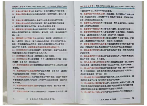 1、桓台县黄河龙小区 16 号楼周兵之妻 52 岁小脑梗塞导致看事重影头疼眩晕、恶心、肚胀胸闷全身无力、左耳听不上事, 双腿发凉通过某院某诊所治疗一个多月无效来治疗 2 个半月完全康复。