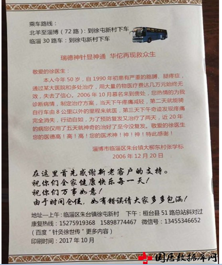 本人今年 50 岁,自 1990 年初患有严重的胳膊、腿疼症,通过某大医院和多处治疗,用大量药物医疗费达几万元始终无效,失去了信心。2006 年 10 月慕名来到贵处,您热情的为我诊断病情,制定治疗方案,当天下午疼痛减轻,二天就能骑自行车由 8 公里以外的里程来就医,三天下午奇迹发现疼痛完全消失、行动自如,为了预防复发又治疗了两天,近 20 年的病您仅用了五天就神奇的治好了至今没复发。敬爱的徐医生您的医德高!高!高!您的医术神!神!神!特此感谢!