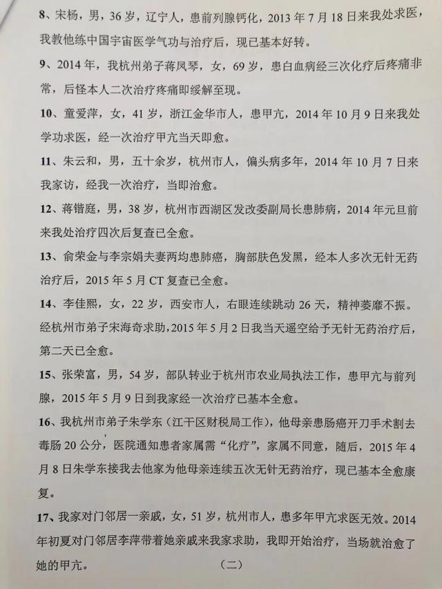 4.温州张锋,男,36岁,他自我感觉头部与颈部似有动物在足弄他似的疼痛,使他整日低着头,曾去广东治疗,医师知道是何动物,但无法治疗。2012年7月6 日来杭州请我帮助,我教他练中国宇宙医学气功并治疗后终于治愈。