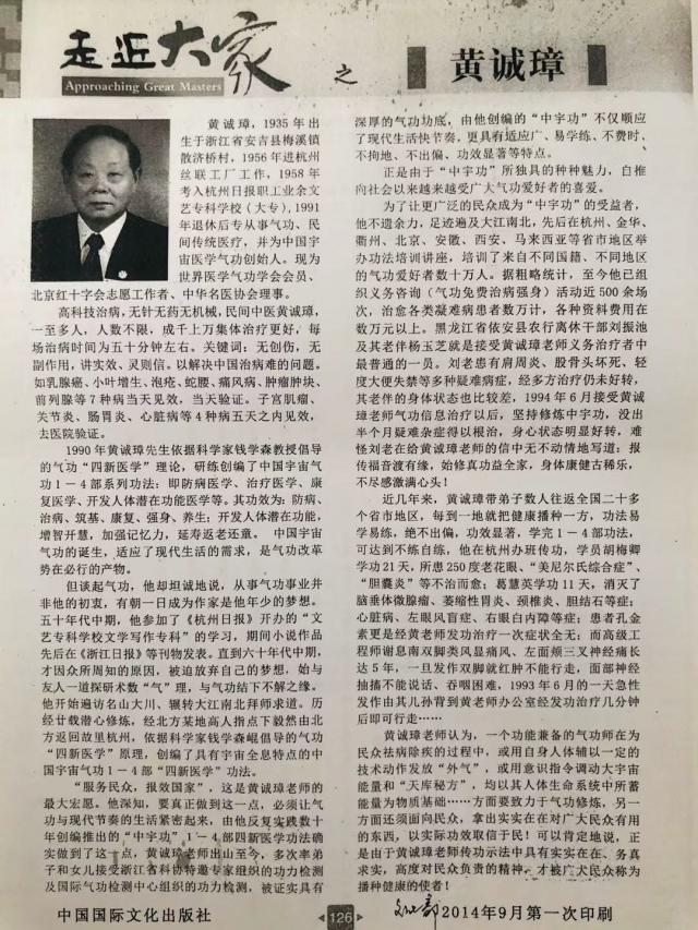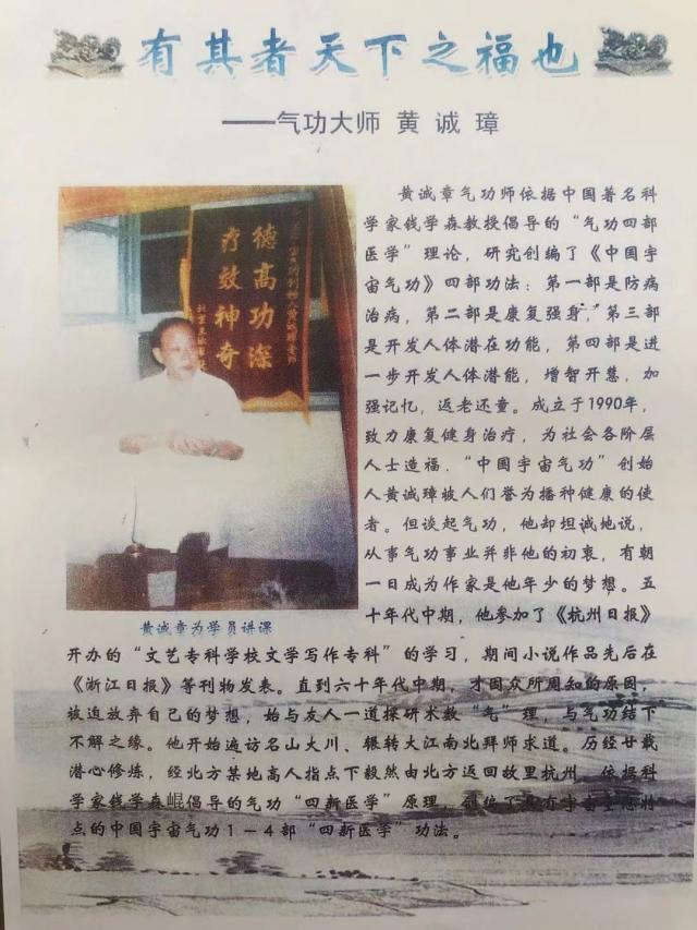 黄诚章男,浙江安吉人。中华名医协会理事,世界民间传统疗法师联谊会高级疗法师。中国宇宙医学气功创始人,致力于人类生命健康事业。