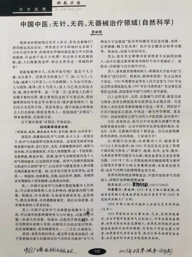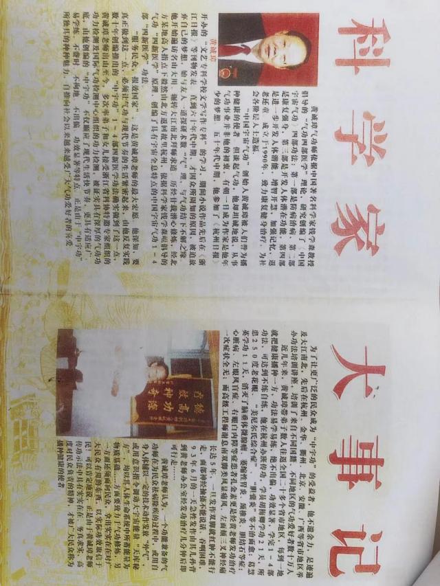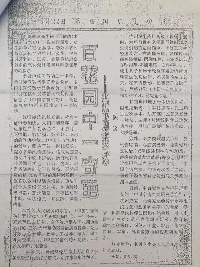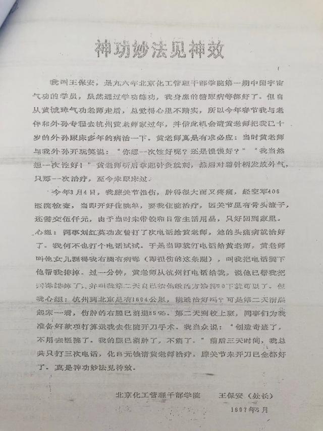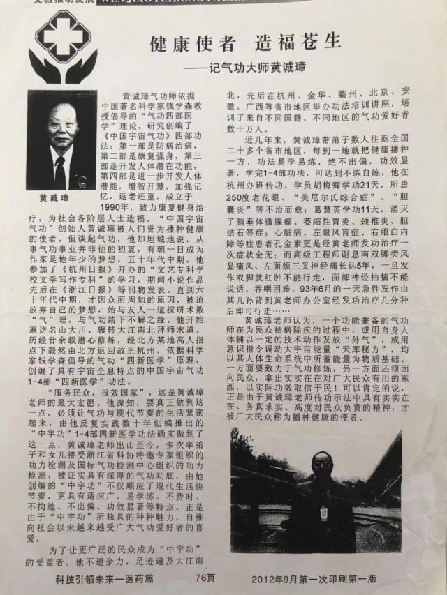20. 南尚武:男,76 岁,患颈椎病(海军转业工程师)经黄诚章无针无药几次治疗,就此自然好了。患有前列腺,小便也有困难,黄本人给他治了几次就教南工自己治疗方法,后来也就好了。南工前些时走路二腿发飘,走不准直线,这是两腿无力之故。于是贡信汇教南工学气功,首先帮他打通小周天与大周天,然后给他治疗了几次后就教他自己治疗,现在南工已康复如初,他全家人都高兴!他澳洲的女儿也赶来杭州学气功。