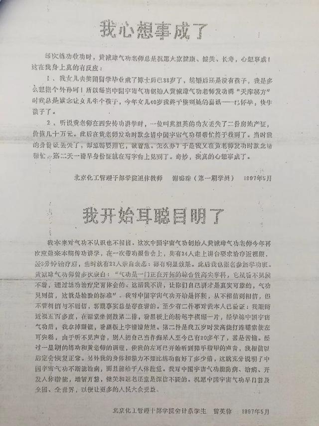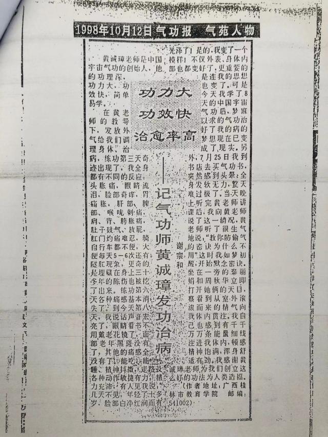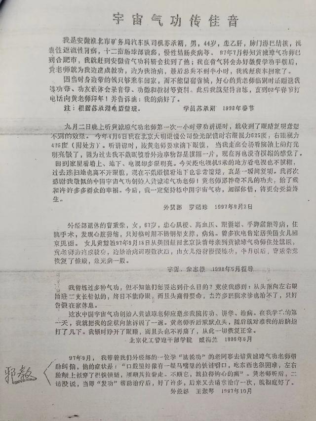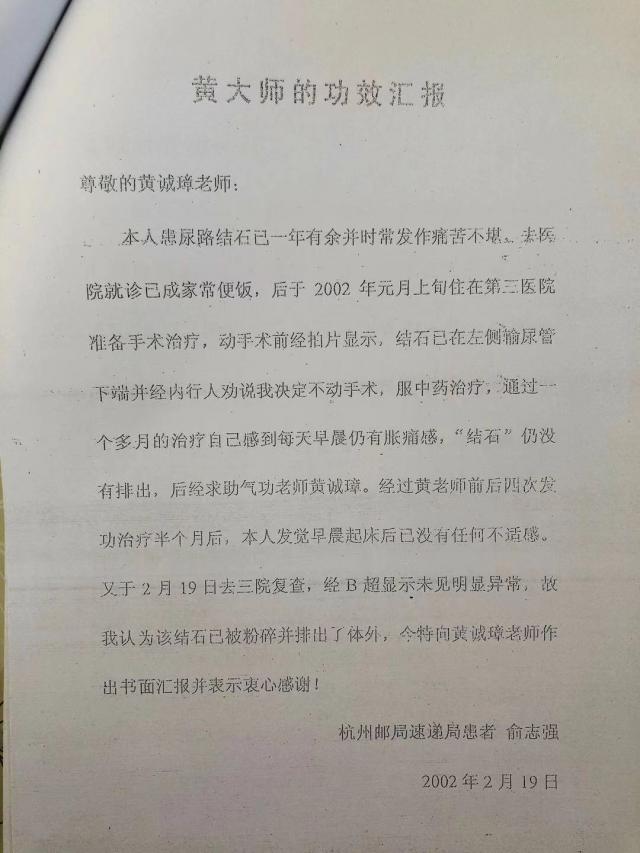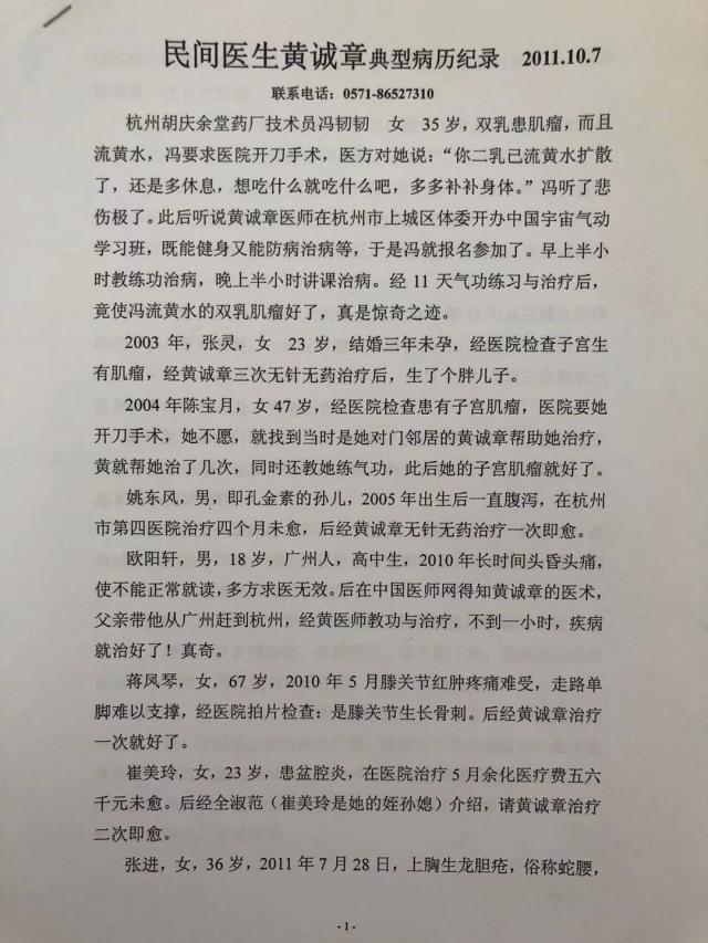6.2004年陈宝月,女47岁,经医院检查患有子宫肌瘤,医院要她开刀手术,她不愿,就找到当时是她对门邻居的黄诚章帮助她治疗,黄就帮她治了几次,同时还教她练气功,此后她的子宫肌瘤就好了。