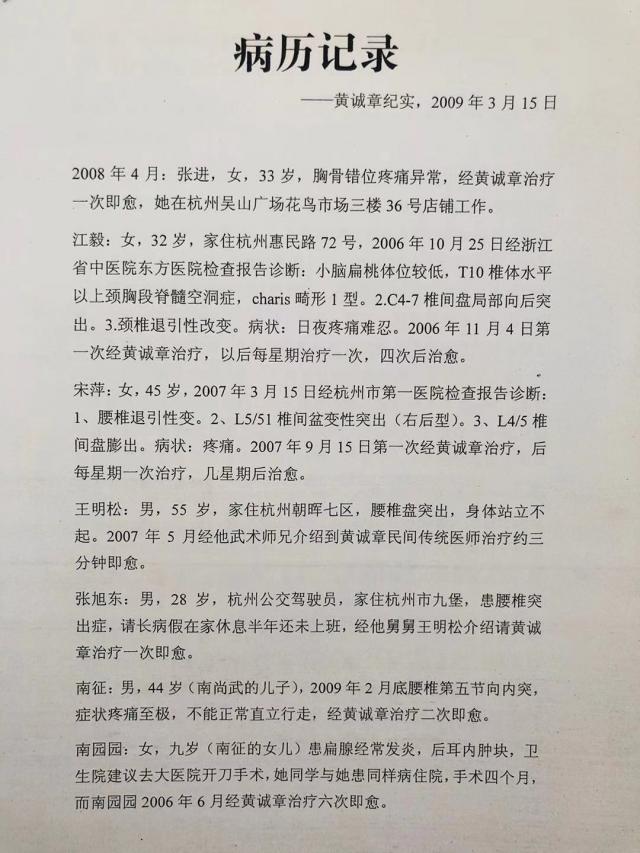 13.南君,女,34岁,南尚武的侄女儿,2010年11 月从三楼水泥楼梯跌下后,尾骨断裂,一至五节腰椎骨错位突出,经浙江黄岩当地医院治疗半年仍不能正常生活而疼痛不止。2011 年 4 月后三次到杭州经黄诚章治疗已经基本恢复正常。