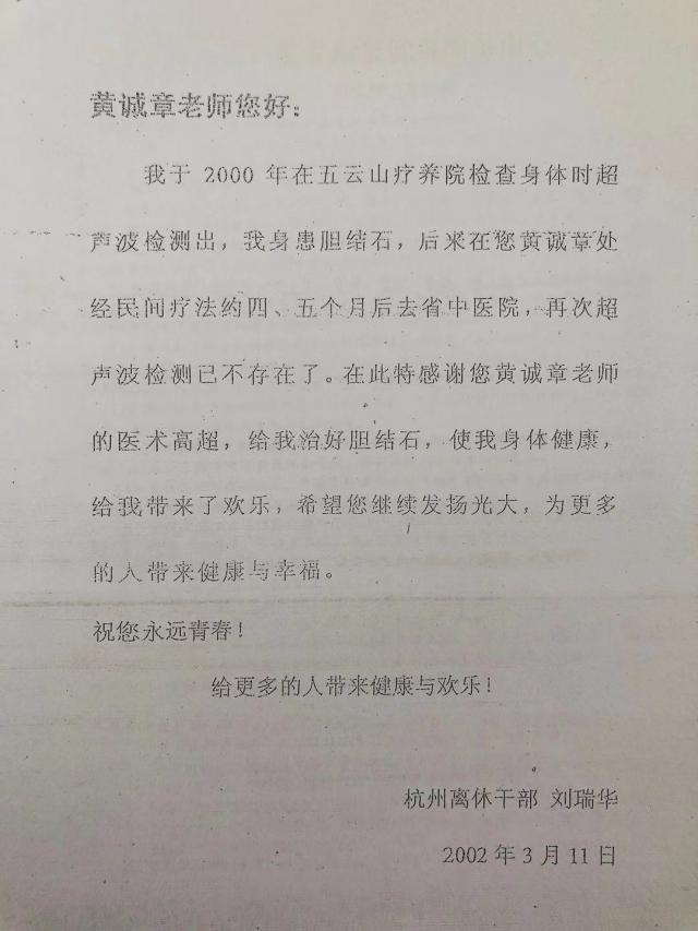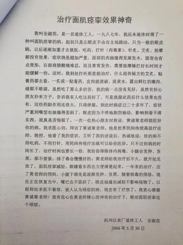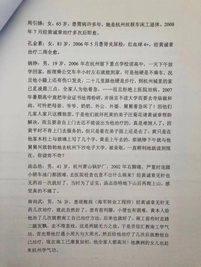 18.姚铮:男,19岁,2006 年在杭州留下重点学校读高中,一天下午放学回家,按理乘公交车半小时左右就能到家,可是他硬是不乘车,况且他小腿上还有伤口发炎,二十几里路他硬是步行,到杭州城里的家也已是凌晨三点,全家人为他着急,......而且拒绝上医院治病。2007年暑期高中竟把毕业证书扯得粉碎,并扬言不读大学而要去寺庙做和尚。可怜把母亲、爷爷、奶奶、外公、外婆、舅舅着急坏了!因他们几家人家只这棵独苗。于是他们就拜托黄的弟子汪菊花请黄诚章帮助解决,而且要亲自上门去还不能说出为他治疗的。真是难煞人了。因黄平时不肯上门去服务的。但只是看在弟子面上还是去了:黄只是在他家木柱上与玻璃上写了几个字,黄是上午去的,那姚铮下午就与他舅舅兴致勃勃地去杭州下沙电子大学,被录取,一直顺利地就读到现在。你说奇不奇?