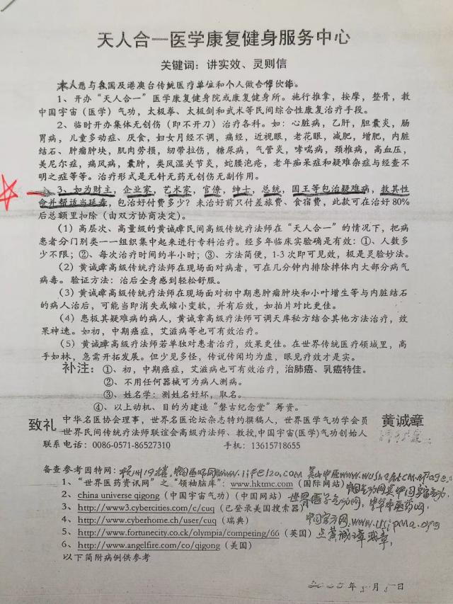 长期临床实践中,形成了独特的讲实效并创新的医疗风格,深得民众的好评与信赖。黄诚章医师现釆用〈高科技手段丶即无针无药无器械治疗法〉:治乳腺癌,甲亢,痛疯病,偏头痛,前列腺,肿瘤肿块,颈椎病,小叶增生,腰椎盘突出,蛇腰,泡疮等可当天治疗当天见效丶当天验证。子宫肌瘤,肠胃病,心䒙病;初中期的癌症,白血病,艾滋病等疑难杂症治后,可在五天内去医院检查前后对比,效果惊人 !(如有特殊要求的病人:可协面谈)。
