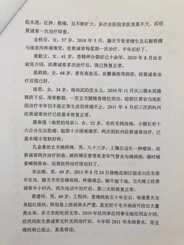 17.黄建铃,男,69.岁,工程师,患痛疯病五十年左右,每逢夏天全身起红斑块,特别是上肢淌黄水严重,直至把干毛巾淌成可绞出大量黄水来,多方求医吃药无效。2010年经同单位同事全淑范同志介绍,经民间医生黄诚章无针无药治疗后,今年即2011 年未淌黄水,而且痛疯病已逐止,真是奇迹。