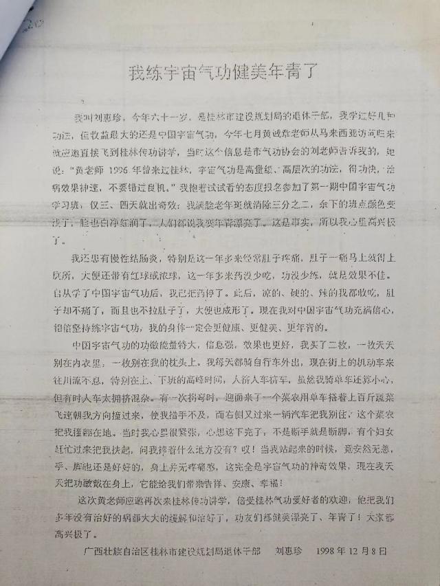 3.1998年,一天晚上我在马来西亚传功讲学前,一老妇患胃癌要求治疗,我当即给于她治疗,半月后她儿与媳和老妇本人表示:胃癌已给她治愈,深表感谢。