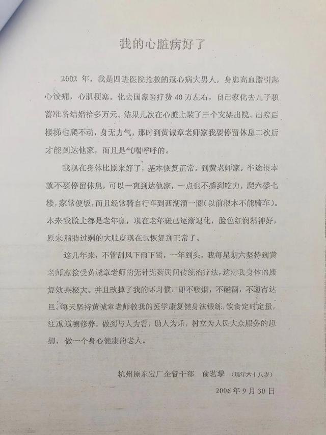 19.汤志浩:男,41 岁,杭州萧山锅炉厂,2002 年右脚痛,严重时连踏小轿车油门都困难,去医院检查也查不出什么病来?经黄诚章无针也无药治一次就好了,当时为了证实,汤志浩特地下山后再爬上山,感觉真的不痛了。