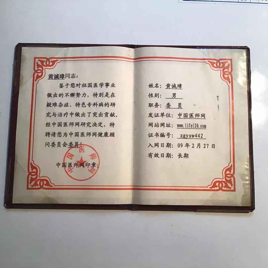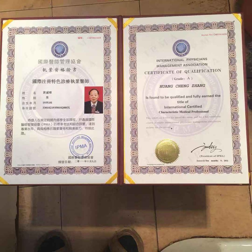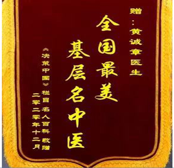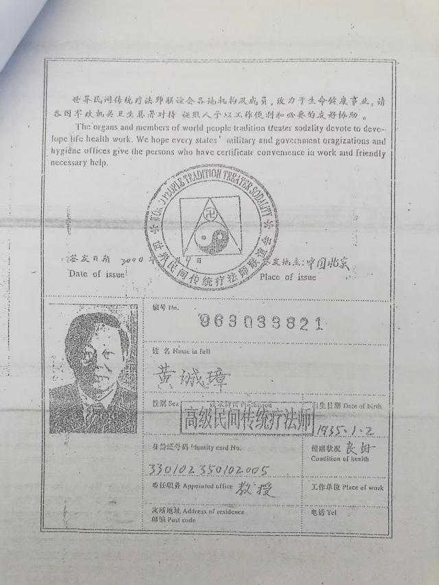 2000年9月在北京“迎21世纪全国首届民间传统疗法经验交流大会”上,黄诚章教授荣获全国首届高级民间传统疗法师金牌得主桂冠。