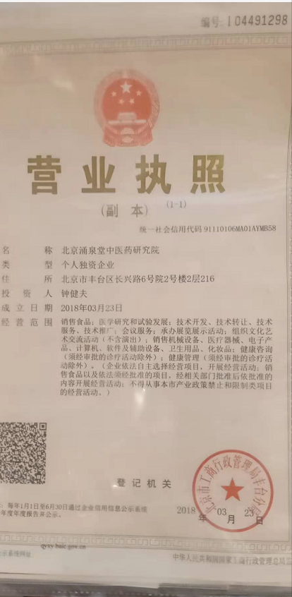 2012年创办北京涌泉堂中医药研究院至今任法人和院长。研究院有一批研究成果,比如植物饮品平衡液及一些外用产品等将逐步推向社会,福利天下百姓,健康全人类!
