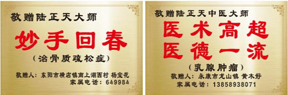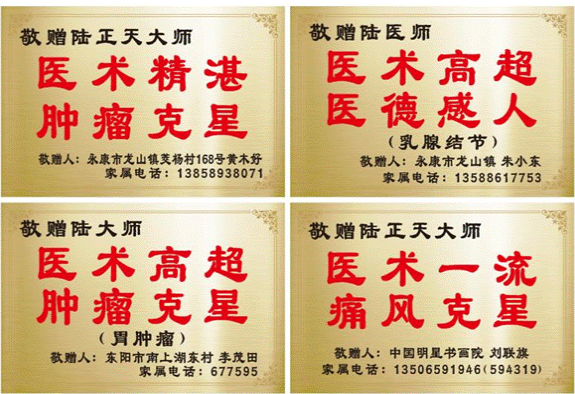 陆医生从医几十年,医术有独到之处,治愈了许多的疑难杂症,他的医术在民间得到了人们的认可和赞誉,在2009年被浙江金华《浙中儿女》杂志称为"民间奇医陆正天"。 陆正天始终认为荣誉不能代表一切,治愈患者是我一生的追求目标。