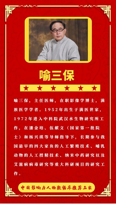 喻三保,主任医师,在职影像学博士,满族医学学者。1952年出生于满医世家,1972年进入中科院武汉水生物研究所工作,在潘金培、伍献文(国家第一批院士)和杨兴琪等导师指导下,长期参与我国最早的四大家鱼的人工繁殖技术、哺乳动物的人工授精技术、纳米中药研究以及艾滋病病毒研究等重大科研项目的研究工作。恢复高考之后,1979年考入湖北中医药大学中医系,毕业后在湖北医科大学附属医院综合病房从事医学临床、教学及科研工作,并在职攻读了华中农业大学生命科学硕士学位。多年来在继承满医家族对菩提蜜与中药酶化培养技术的基础上,长期从事中西医与生命科学结合的研究,并在肿瘤癌变与本质、心脑血管疾病以及眼底诊断、CT、MRI医学影像诊断等方面积累了丰富的临床经验,30多年来治愈了近力例肿溜和心世管疾病的思省。