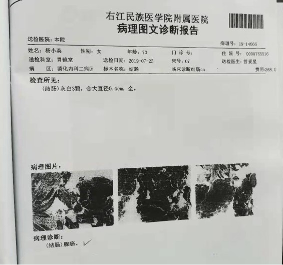 杨小英,女,71岁,一个星期无吃食物,呕吐,饮水不下,入住广西右江民族医学院附属医院,于19年7月23日检查结果是肠腺癌,胃癌,肺,食道疑似癌不留医,通知家属送回家,准备后事,第二天家属来恳求我尽量帮治,反正都是向西天去了。那我尽量想办法按祖传下实钱验方试试看她的命运,经治疗欲饮小量米粥汤,又不吐了,继续治疗三个月,起死回生,恢复健康,于19年经我治疗在医院确诊危重癌症数人不治送回家,现在无疾病健康!治愈各癌症数不胜数不能一一例举。