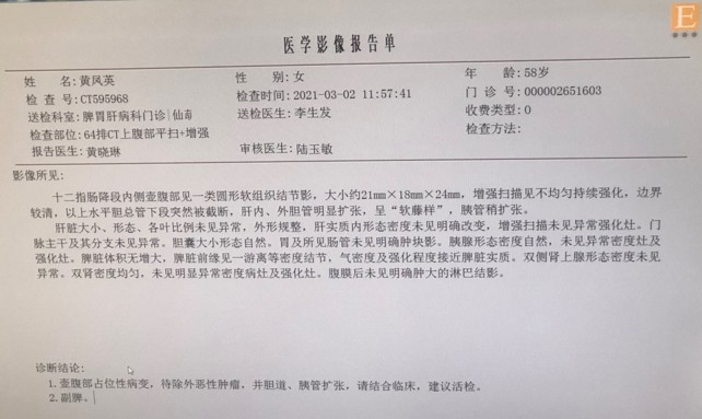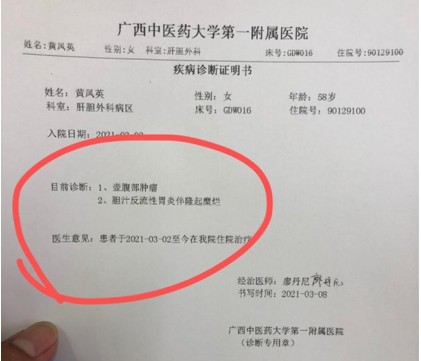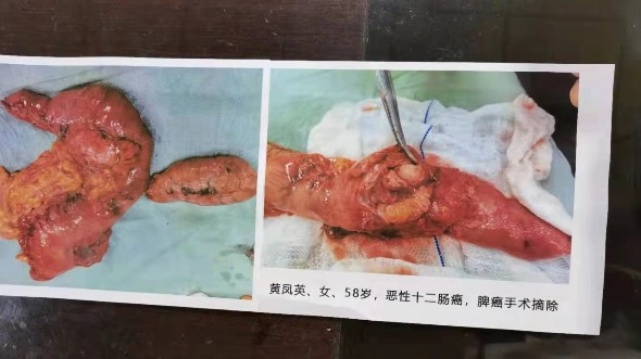 上是黄凤英,女,58岁,于2021年3月份住进广西中医药大学第一附属医院检查确诊脾癌,肠癌,手术摘除后一直下腹痛,欲呕无进食物;只是静脉滴注各种药物及能量,止不了痛及欲呕,病情危重通知家属送回家。苐二天家属开小车与患者一起来我处门诊,恳求我帮治,我说:无法救治了;家属说有什么挽救不了不会怪医师,又是他的命定了。那就我试试吧,用我祖传的临床验证方药,用注射器小量灌服1O多天,欲想饮小量米粥,下腹部又不痛又不欲吐了,现治疗用药二十几天,家属很开心。