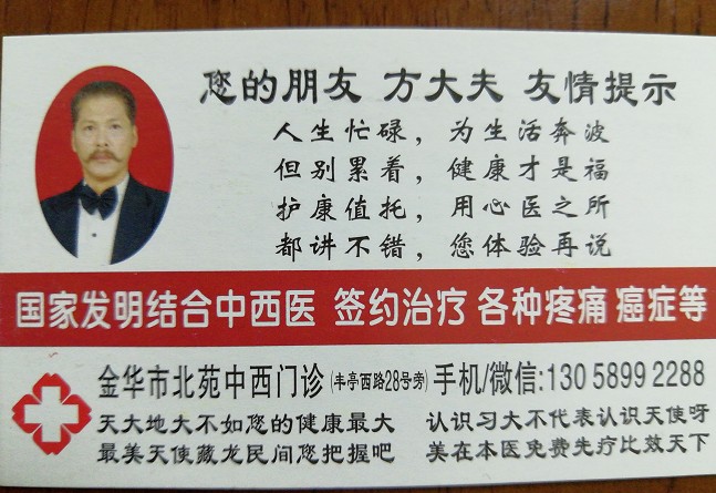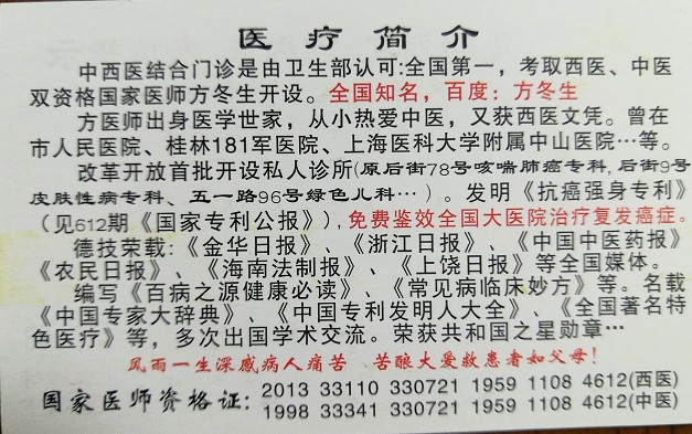 方大夫早在87年就开设浙中首家性病专科门诊,经十多年努力,至今,他以精湛的医术,高尚的医德,享誉四方。方大夫出身医学世家,从小热爱祖国医学,他先后自学了《医宗金鉴》、《本草纲自》、《实用中医学》等中医药书籍百余册。经十多年艰苦自学并在《辞海》医药分册姜春华教授帮助下,打下良好的中医药学基础。94年完成性病顽疾尖锐湿疣治疗突破进展,国家发明专利,95年又取得了“一种抗癌减肥茶”国家发明专利(专利号:96107909.6)。他的业绩在全国及香港百余家书、报、刊发表过,名入《中国知名专科医院》(香港中华医学研究会出版)。