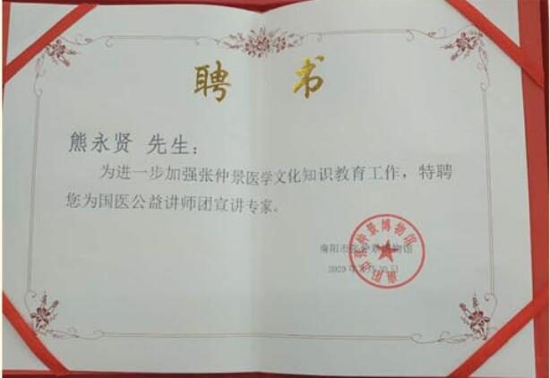 熊永贤1978年拜师学医,跟随其师父学习中医十多年,研究和探索多种疑难杂症的治疗方法。经过多年的努力,研制出了养髓通脉疗法,并以中药和经络按摩配合,应用于心脑病变。经细心研究实验配制出了可应用于皮肤瘙痒的药方、可应用于牛皮癣的中药方,得到了牛皮癣患者的好评。善于调理咽炎、风火眼、青盲、白内障、风湿麻木、腰间盘突出、三高症、冠心病、糖尿病等疾病,精湛的医技得到了广大患者的认可。
