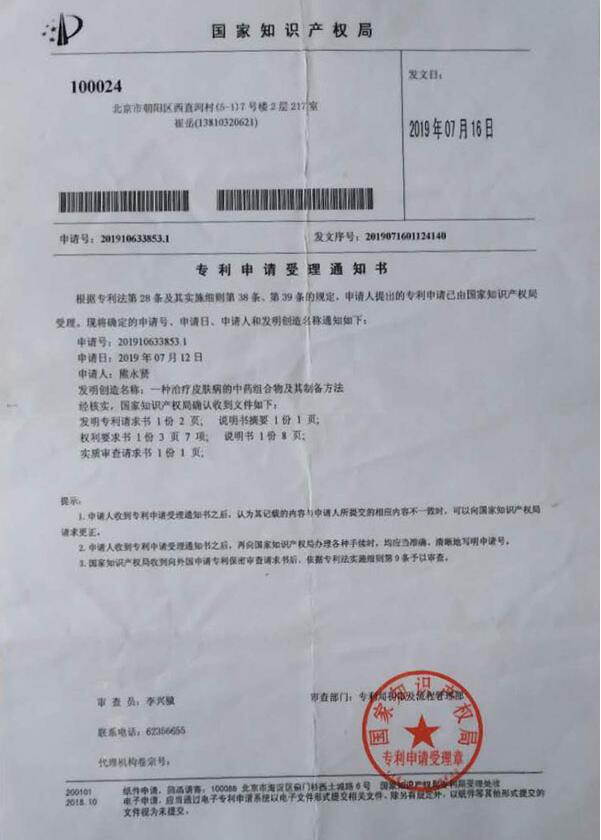 代表成就:一种治疗皮肤病的中药组合物及其制备方法,申请号:201910633853.1 。