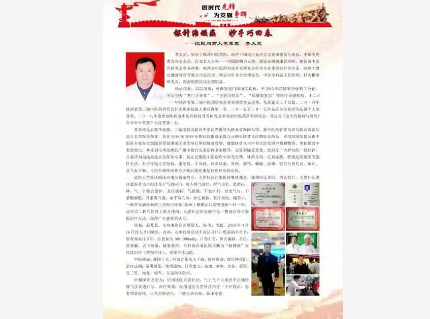 李大定,陕西省宝鸡市人,现任陕西省中医药研究会常务理事、陕西省针灸专业委员会针药结合专家。西安市针灸学会研究员,中医全科副主任医师,西府国医馆馆长,陕西大慧定健康管理有限公司总经理,中国医药教育协会会员,行业名人百科中国影响力人物,国家高级健康管理师等职务。国家级名老中医仝俐功学术继承人,中医药非物质文化遗产传承人,于二0一一年陕西省第二届中医药研究会曾获得优秀先进奖,发表论文三十余篇,二O一四年在陕西省第三届中医药研究会针灸推拿技能大赛获得第一名。主编《道医针灸术》《大慧定临证校验秘方》,好医生门诊网(华健百科)特邀名医入驻专家。其事迹先后被中央台CCTV栏目,华商报、三秦道教等40多家媒体相继报道。被陕西中医药界报道为陕西省新闻人物,被中医药管理局评为陕西省民间高人。