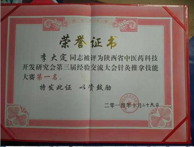 2014年陕西省第三届中医药研究会针灸推拿技能大赛获得第一名。