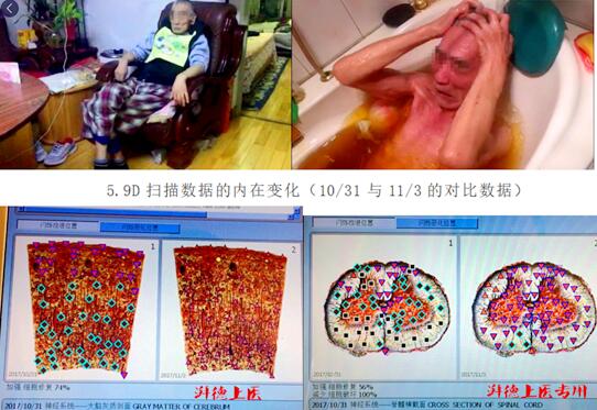在西医看来几乎所有的脑部问题症状都是不可逆转的:重度老年痴呆、脑萎缩、陈旧性脑梗死、双脚僵直(零角度弯曲)、无意识、无语言功能、无运动机能等。