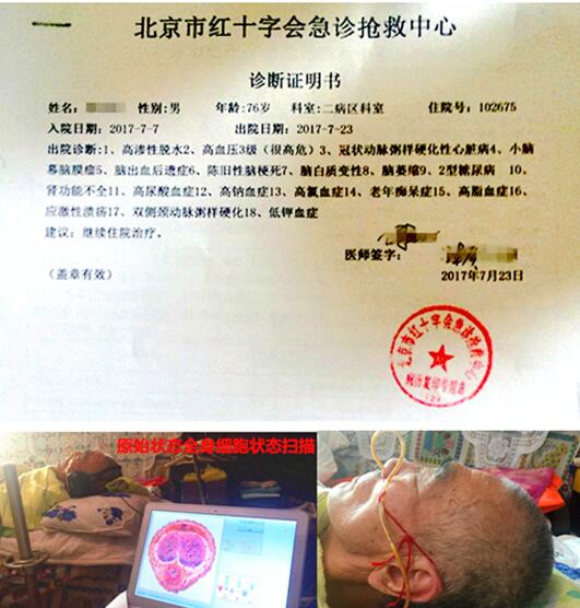 长久卧床不起、患者无意识、口吃不清(舌卷、吐不出清晰的字)、无法自主进食(鼻饲)、双眼模糊(双手摸索,几乎无视力)、无法定位空间位置(左右手)、两腿僵直(无法弯曲、如木棍,北京几家著名医院都已放弃)、双手握拳(手指无法伸直)、大小便失禁等,全身性大面积瘀堵明显,特别是脑部、心脏。五脏六腑都出现明显衰弱现象。